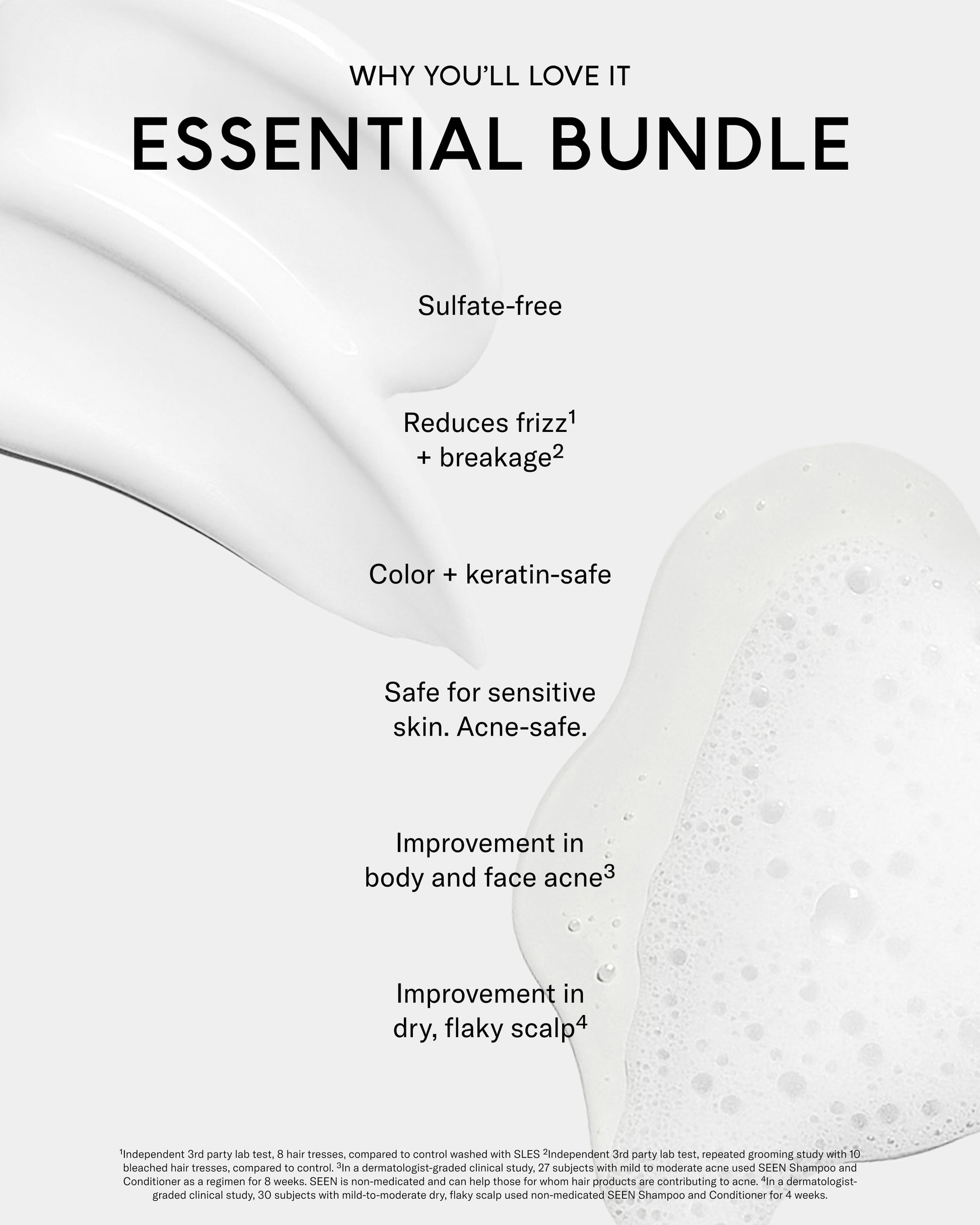 70% with body acne improved*52% with face acne improved**In a dermatologist-graded clinical study, 27 patients with mild to moderate acne used SEEN shampoo and SEEN conditioner, with optional styling products, for 8 weeks.93% with dry scalp improved**73% agree my scalp feels calmer****In a dermatologist-graded clinical study, 30 patients with mild to moderate dry, flaky scalp used SEEN shampoo and SEEN conditioner, with optional styling products, for 4 weeks.