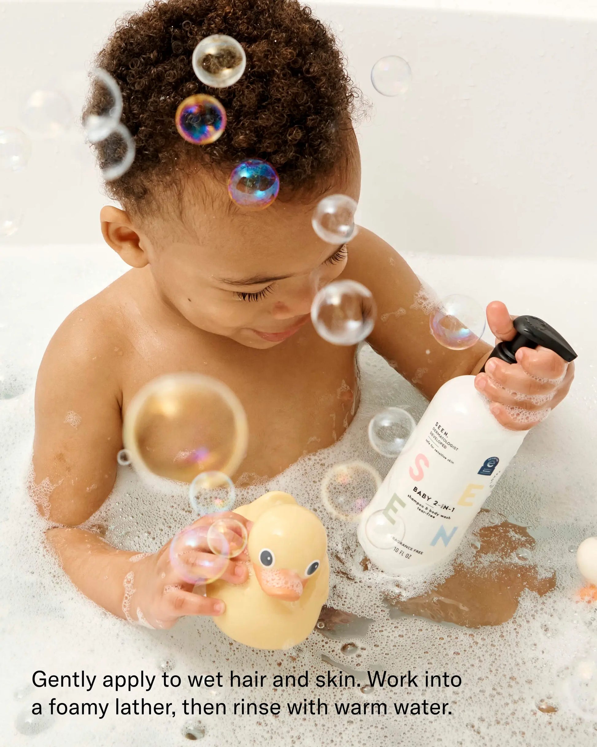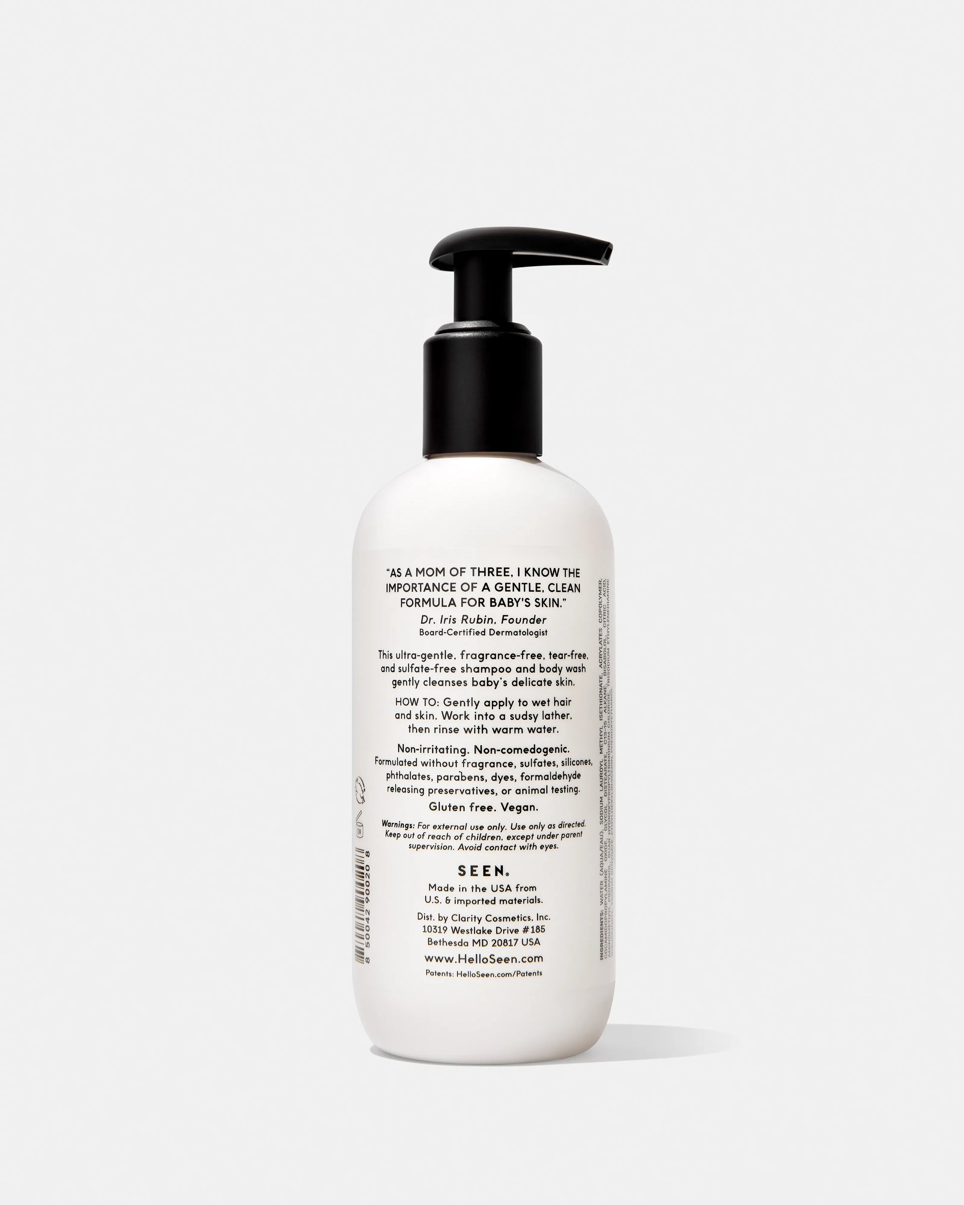 SEEN Baby 2-in-1 is an ultra-gentle, fragrance-free shampoo and body wash designed for babies' delicate skin. It's tear-free, sulfate-free, and safe for even the most sensitive skin.
